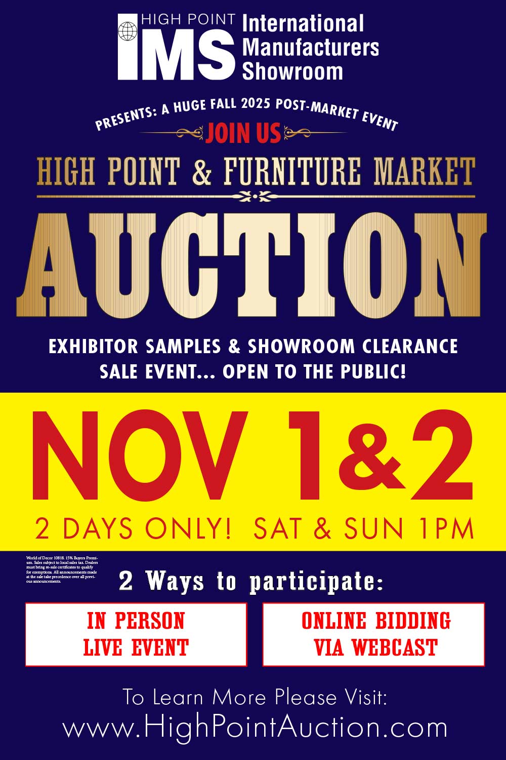 Join us Saturday & Sunday, November 1st–2nd at 1PM for the World of Decor Fall Auction, live in High Point, NC and streaming online at worldofdecor.hibid.com. Over 3,000 unique market samples, prototypes, and one-of-a-kind designs from 100+ global brands will be released to the public—offered at auction value, where you set the price. From statement furniture to rare art and décor, this is your chance to secure extraordinary pieces while experiencing the thrill, energy, and strategy that make auctions so exciting. Nationwide shipping available.